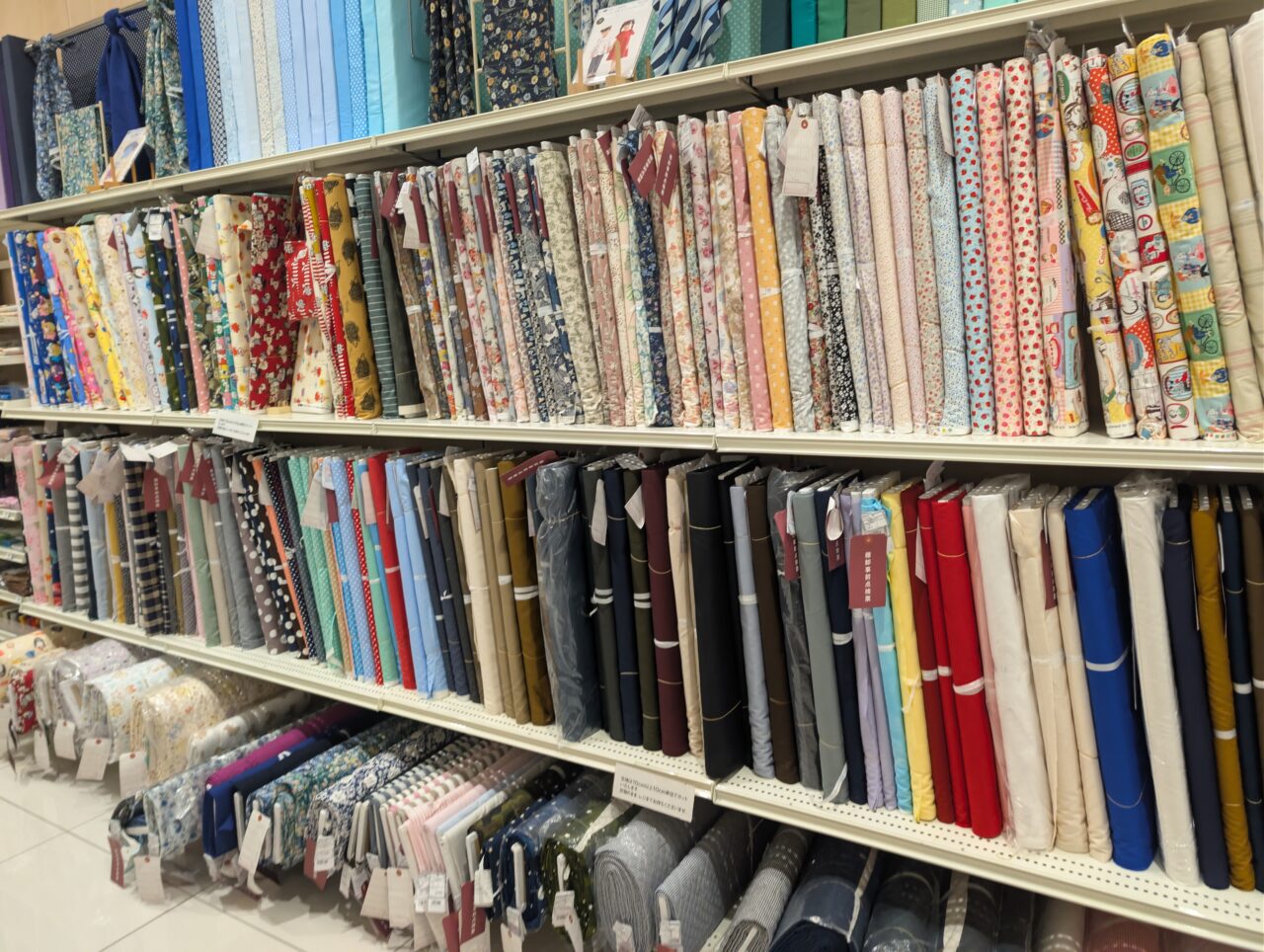 布生地は綺麗に陳列されてとても見やすくなっています。 可愛らしいデザインの布地からシンプルな無地生地まで、ハンドメイドに使いやすそうな生地がたくさんありました。