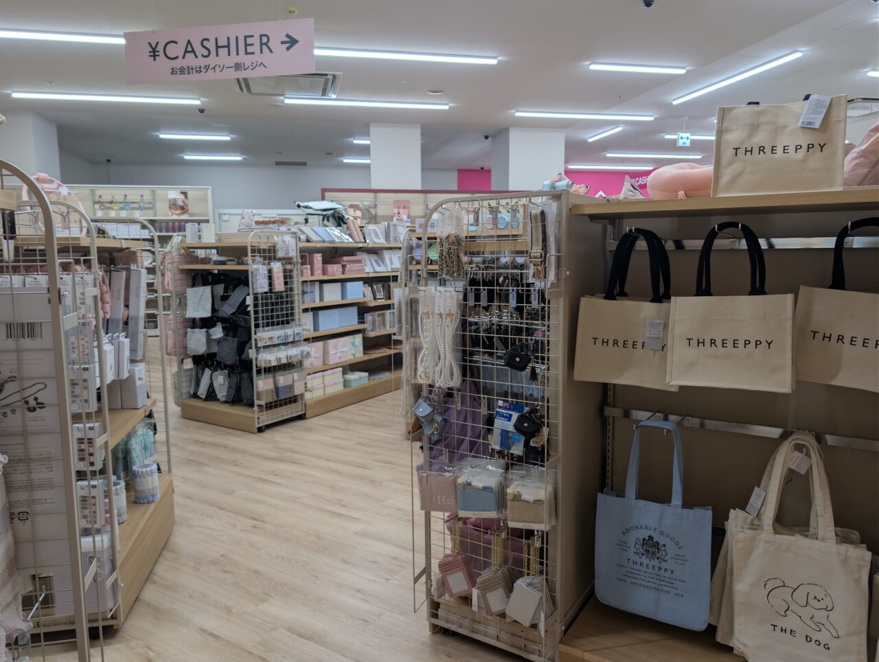 THREEPPYのかわいい雑貨も並び、店内は明るく商品ラインナップも充実しています。